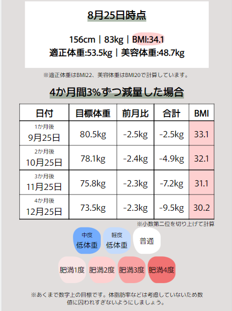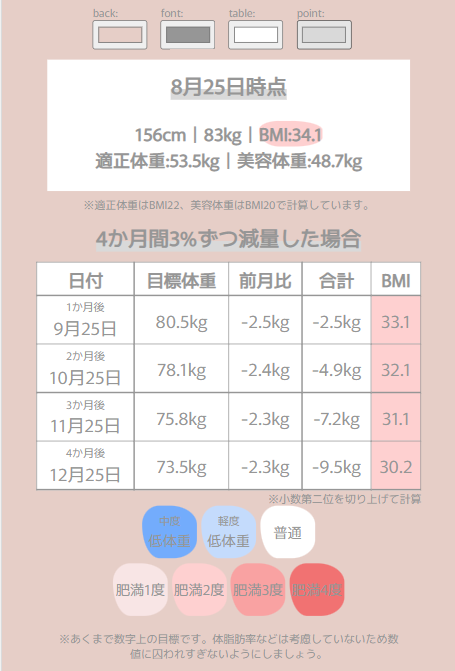 なんて簡単なんでしょうか、いちいち電卓を利用しなくても一目で1か月に落としていい体重がわかるようになりました。