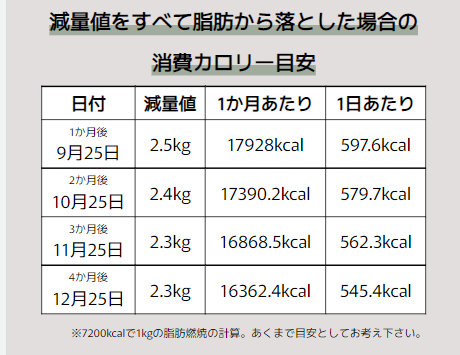 減量値の一覧表の下には、その減量値をすべて脂肪で落とそうとした場合の消費カロリー一覧が表示されます。