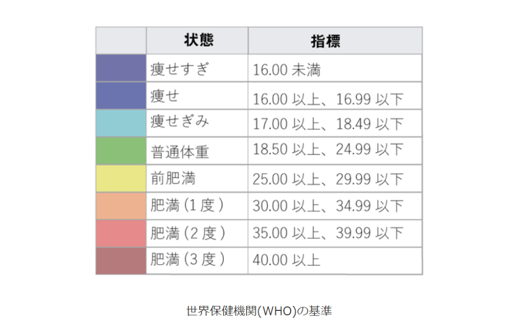 日本の基準ではBMI18.5以下が低体重の数値とます。ツールでは18.5以下も表示していますが痩せすぎも健康に良くないのでそこからの減量を推奨する意図はありません。